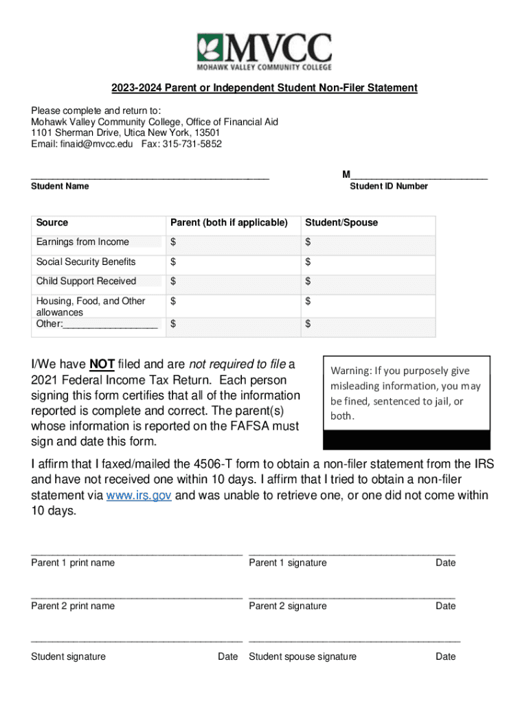 20232024 Parent or Independent Student Confider Statement Please complete and return to: Mohawk Valley Community College, Office of Financial Aid 1101 Sherman Drive, Utica New York, 13501 Email: finaid@mvcc.edu