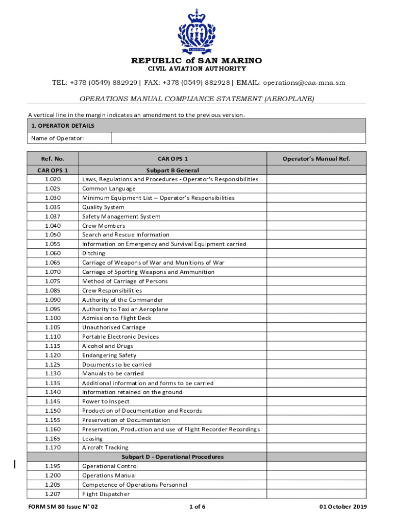 CIVIL AVIATION AUTHORITIES: +378 (0549) 882929| FAX: +378 (0549) 882928| EMAIL: operations@caamna.smOPERATIONS MANUAL COMPLIANCE STATEMENT (AIRPLANE)
