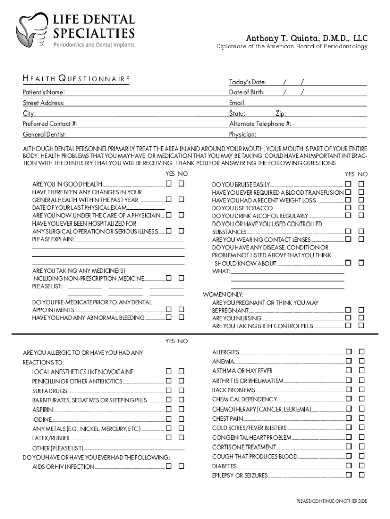 Anthony T. Quinta, D.M.D., LLCDiplomate of the American Board of PeriodontologyH e an l t hQuestionnaireTodays Date:/ /Patients Name:Date of Birth:/ /Street Address:Email:City:State:Zip:Preferred