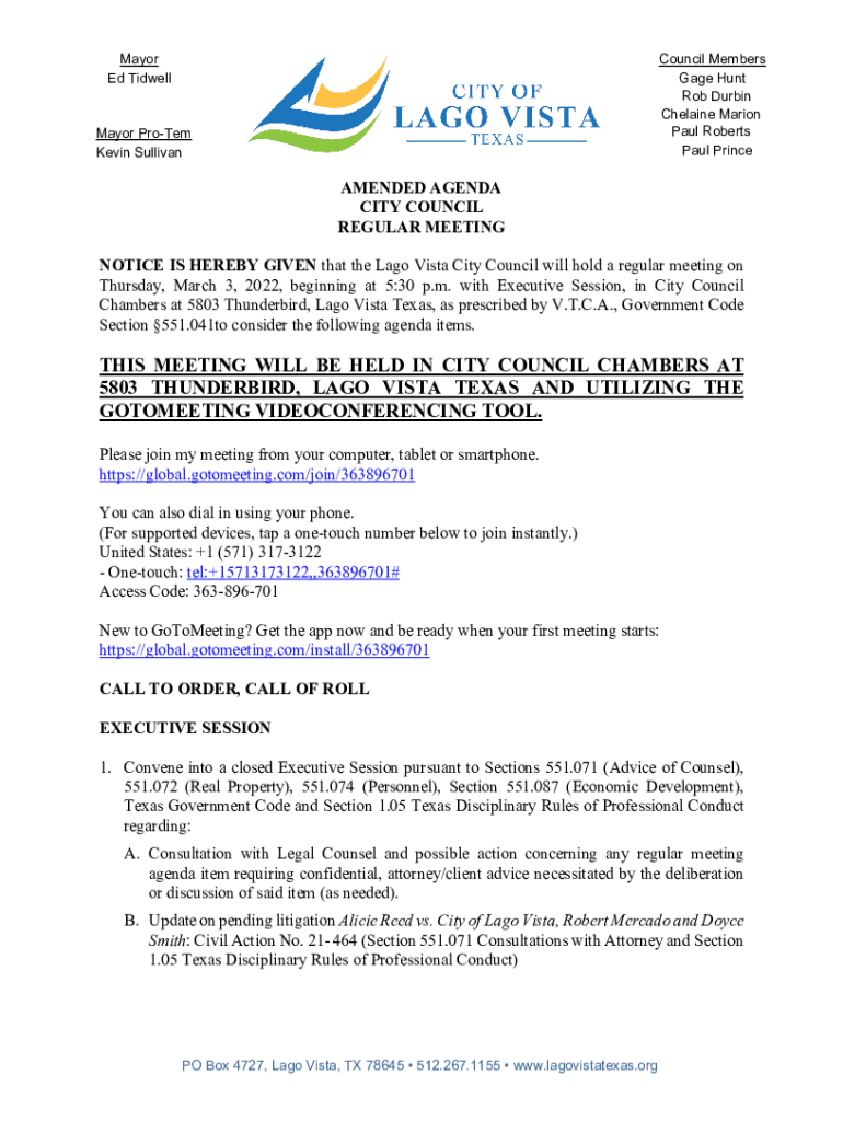 Mayor Ed TidwellCouncil Members Gage Hunt Rob Durbin Elaine Marion Paul Roberts Paul PrinceMayor Wrote Kevin SullivanAMENDED AGENDA CITY COUNCIL REGULAR MEETING NOTICE IS HEREBY GIVEN that the Ago