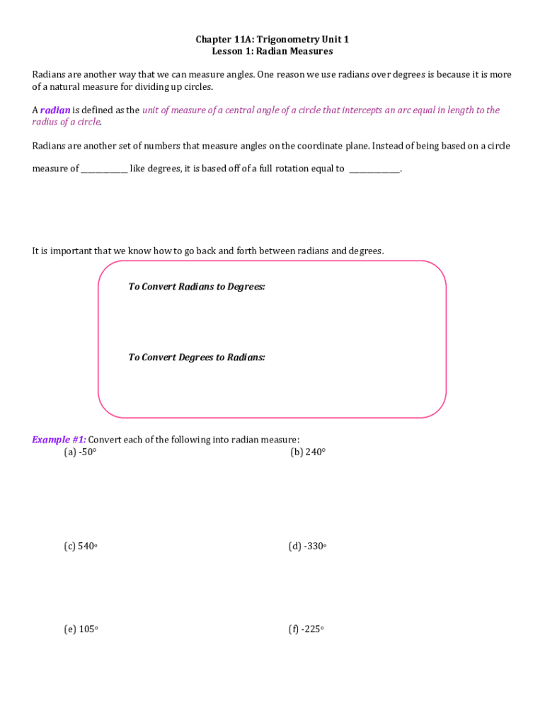 Chapter 11A: Trigonometry Unit 1 Lesson 1: Radian Measures Radians are another way that we can measure angles. One reason we use radians over degrees is because it is more of a natural measure for