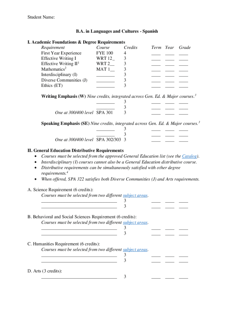 Student Name: B.A. in Languages and Cultures Spanish I. Academic Foundations & Degree Requirements Requirement Course Credits First Year Experience FYE 100 4 Effective Writing I WRT 12_ 3 Effective