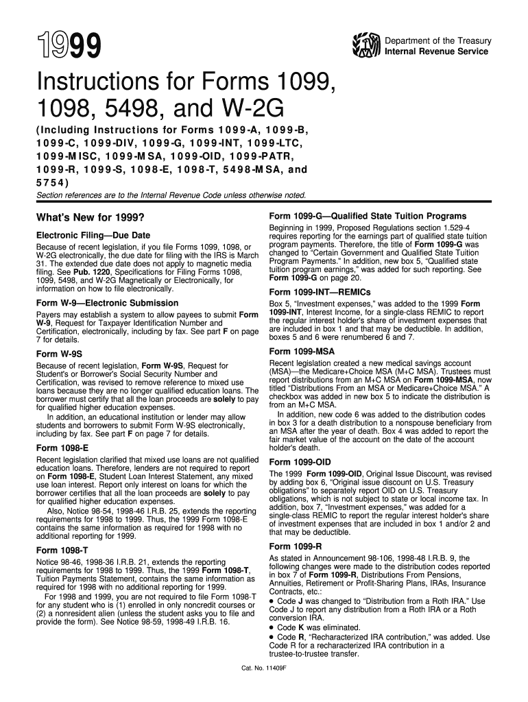 1999 Department of the Treasury Internal Revenue Service Instructions for Forms 1099, 1098, 5498, and W-2G (Including Instructions for Forms 1099-A, 1099-B, 1099-C, 1099-DIV, 1099-G, 1099-INT, 1099-LTC,