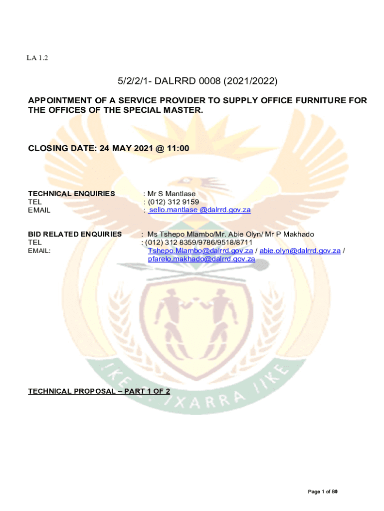 LA 1.25/2/2/1 DARED 0008 (2021/2022) APPOINTMENT OF A SERVICE PROVIDER TO SUPPLY OFFICE FURNITURE FOR THE OFFICES OF THE SPECIAL MASTER.CLOSING DATE: 24 MAY 2021 @ 11:00TECHNICAL Inquiries TEL EMAIL: