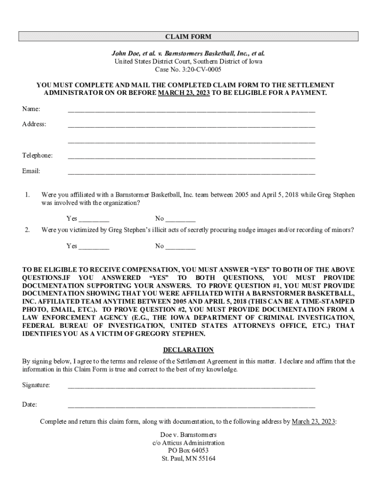 CLAIM FORM John Doe, et al. v. Barnstormers Basketball, Inc., et al. United States District Court, Southern District of Iowa Case No. 3:20CV0005 YOU MUST COMPLETE AND MAIL THE COMPLETED CLAIM FORM