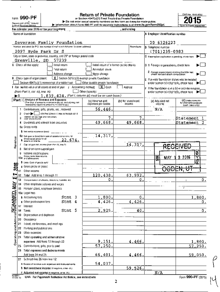 990PF IFormDepartment of the Treasury, Internal Revenue ServiceReturn of Private Foundation calendar year 2015 or tax Year beginning, and endgame of foundation Employer identification numberSeverson