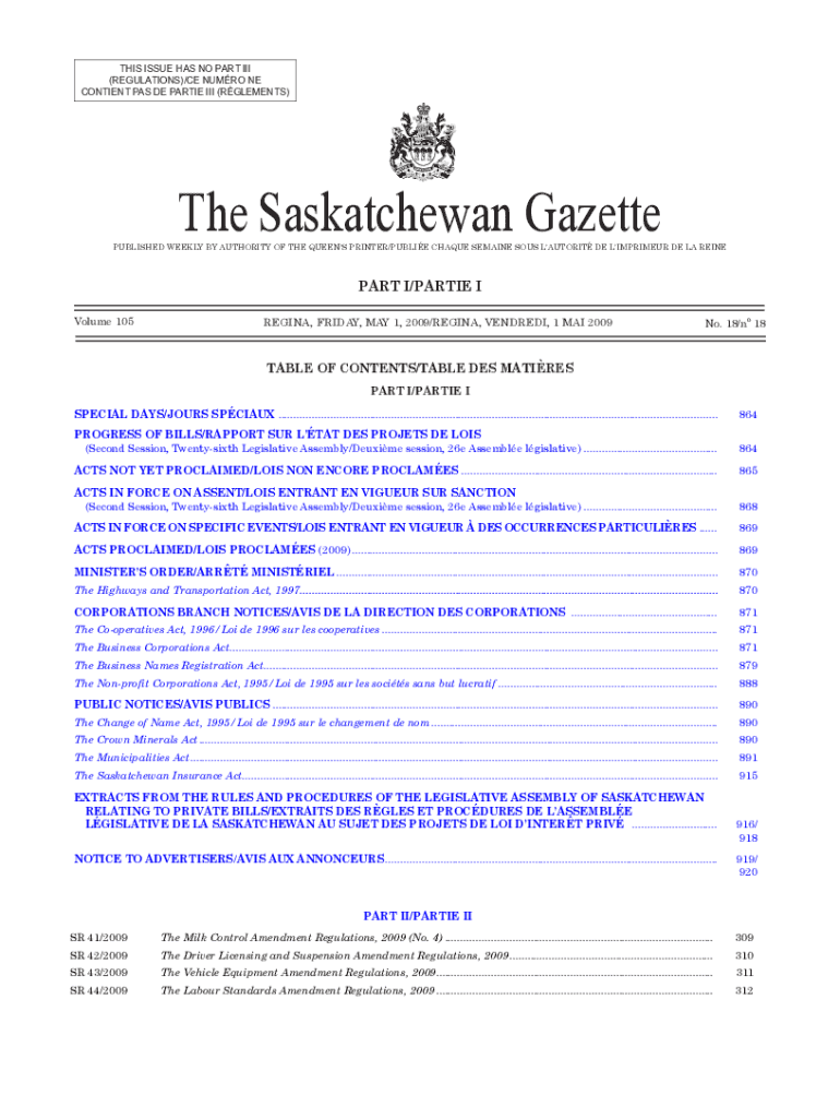 THIS ISSUE HAS NO PART III (REGULATIONS)/CE NU MRO NE CONTENT PAS DE PARTIES III (ELEMENTS)The Saskatchewan GazettePUBLISHED WEEKLY BY AUTHORITY OF THE QUEENS PRINTER/Public claque remained sous autofit