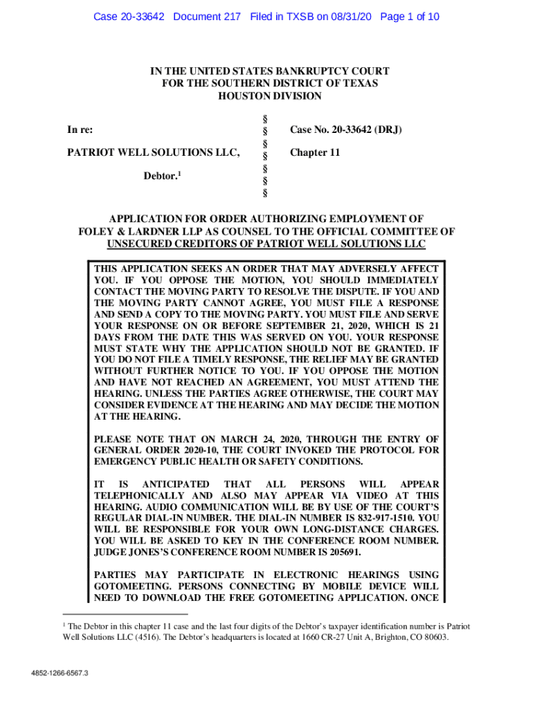 Case 2033642 Document 217 Filed in TSB on 08/31/20-Page 1 of 10IN THE UNITED STATES BANKRUPTCY COURT FOR THE SOUTHERN DISTRICT OF TEXAS HOUSTON DIVISION In re: PATRIOT WELL SOLUTIONS LLC, Debtor.1