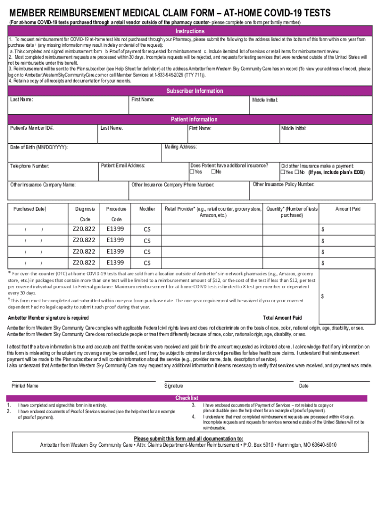 MEMBER REIMBURSEMENT MEDICAL CLAIM FORM HOME COVID-19 TESTS (For at home COVID-19 tests purchased through a retail vendor outside the pharmacy counter please complete one form per family member)Instructions