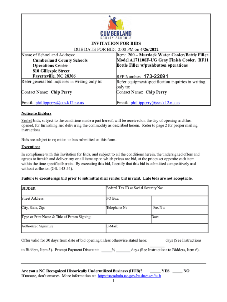 INVITATION FOR BIDS DUE DATE FOR BID: 2:00 PM on 4/26/2022 Name of School and Address: Item: 200 Murdock Water Cooler/Bottle Filler. Model A171108FUG Gray Finish Cooler. BF11 Cumberland County Schools