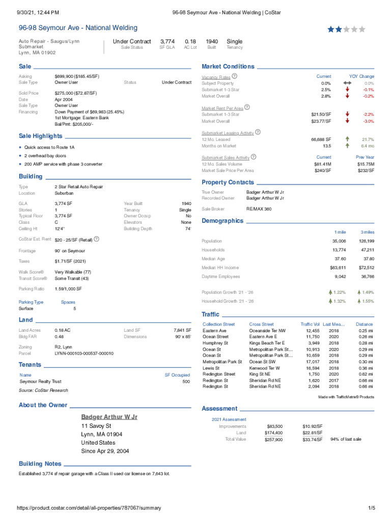9/30/21, 12:44 PM9698 Seymour Ave National Welding | CoStar9698 Seymour Ave National Welding Auto Repair August/Lynn Submarket Lynn, MA 01902Under Contract Sale Status3,774SF GLA0.18AC LotSaleSingleBuiltTenancyMarket