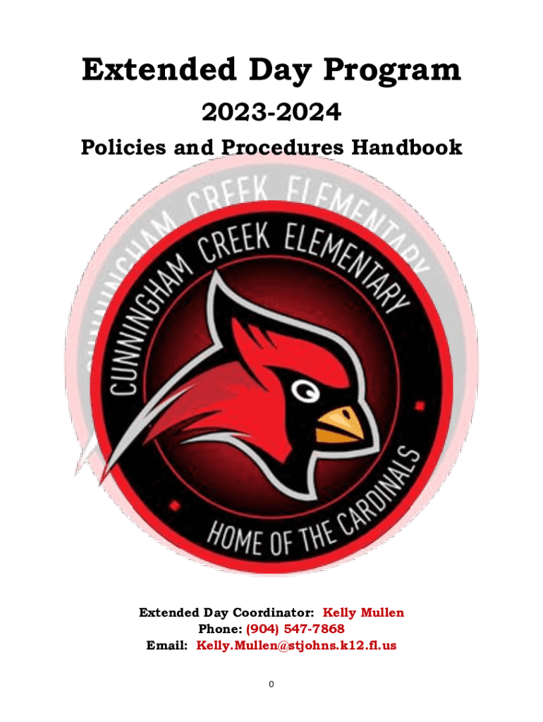 Extended Day Program 20232024 Policies and Procedures HandbookExtended Day Coordinator: Kelly Mullen Phone: (904) 5477868 Email: Kelly.Mullen@stjohns.k12.fl.us 0Table of Contents OUR PROGRAM2PROCEDURES