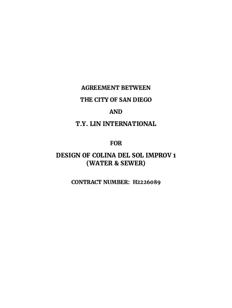 AGREEMENT BETWEEN THE CITY OF SAN DIEGO AND. Y. LIN INTERNATIONAL FOREIGN OF COLIN DEL SOL IMPROVE 1 (WATER & SEWER) CONTRACT NUMBER: H2226089TABLE OF CONTENTS ARTICLE I DESIGN PROFESSIONAL SERVICES