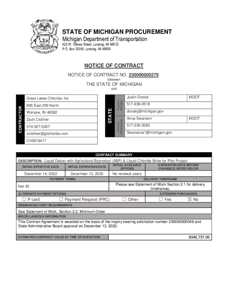 P.O. Box 30050, Lansing, MI 48909NOTICE OF CONTRACT