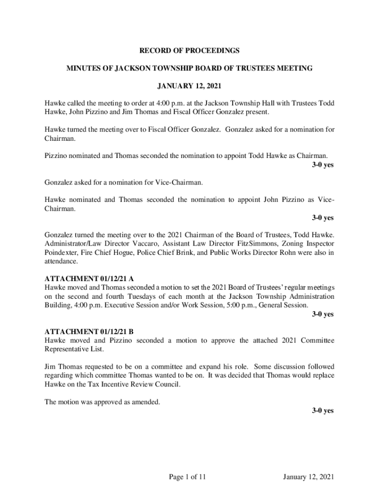 RECORD OF PROCEEDINGS MINUTES OF JACKSON TOWNSHIP BOARD OF TRUSTEES MEETING JANUARY 12, 2021, Hawks called the meeting to order at 4:00 p.m. at the Jackson Township Hall with Trustees Todd Hawks,