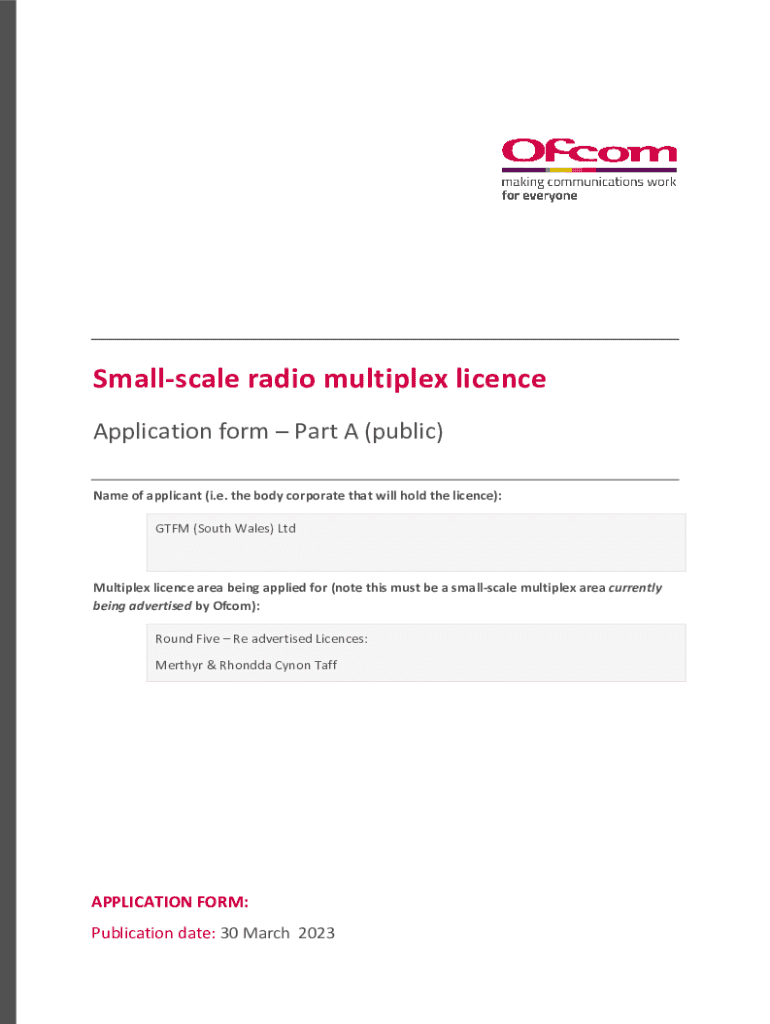 Small scale radio multiplex license Application form Part A (public) Name of applicant (i.e. the body corporate that will hold the license): RTFM (South Wales) Multiplex license area being applied