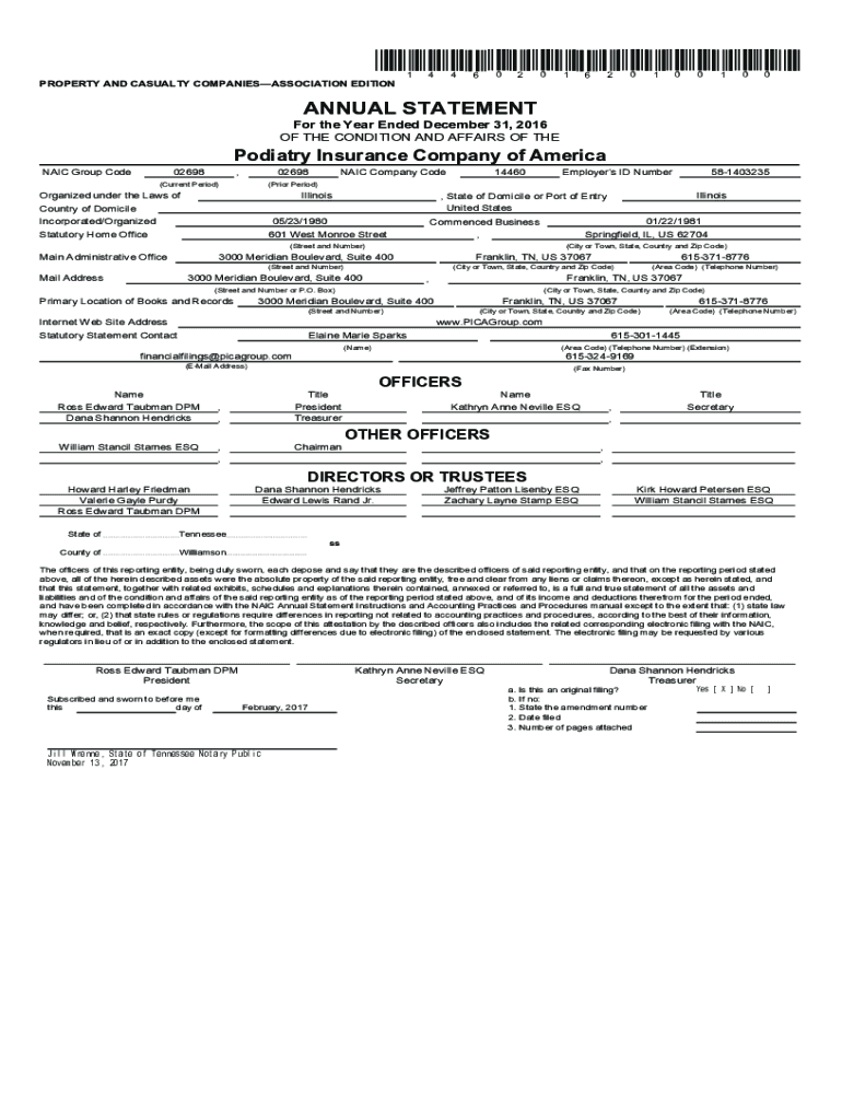 *14460201620100100* PROPERTY AND CASUALTY COMPANIESASSOCIATION EDITIONANNUAL STATEMENT For the Year Ended December 31, 2016, OF THE CONDITION AND AFFAIRS OF Podiatry Insurance Company of America NAIL