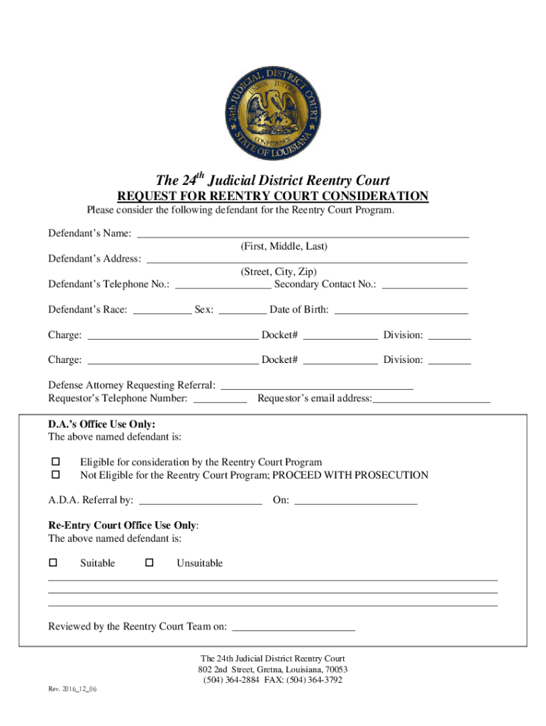 The 24th Judicial District Reentry Court REQUEST FOR REENTRY COURT CONSIDERATION Please consider the following defendant for the Reentry Court Program. Defendants Name: ___ (First, Middle, Last) Defendants