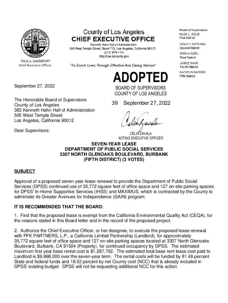 ADOPTED September 27, 2022BOARD OF SUPERVISORS COUNTY OF Los Angeles Honorable Board of Supervisors County of Los Angeles 383 Kenneth Hahn Hall of Administration 500 West Temple Street Los Angeles,