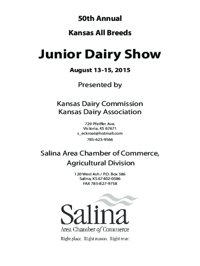 50th Annual Kansas All Breeds Junior Dairy Show August 1315, 2015Presented by Kansas Dairy Commission Kansas Dairy Association 729 Pfeiffer Ave. Victoria, KS 67671 s_eckroat@hotmail.com 7856239566Salina