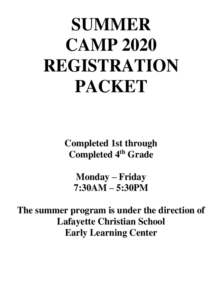 SUMMER CAMP 2020 REGISTRATION PACKET Completed 1st through Completed 4th Grade Monday Friday 7:30AM 5:30PM The summer program is under the direction of Lafayette Christian School Early Learning CenterLAFAYETTE