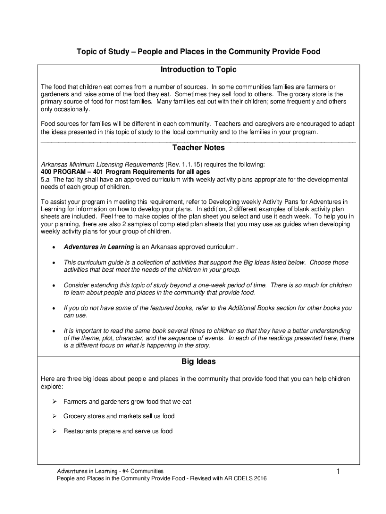Topic of Study People and Places in the Community Provide Food Introduction to Topic The food that children eat comes from a number of sources. In some communities families are farmers or gardeners