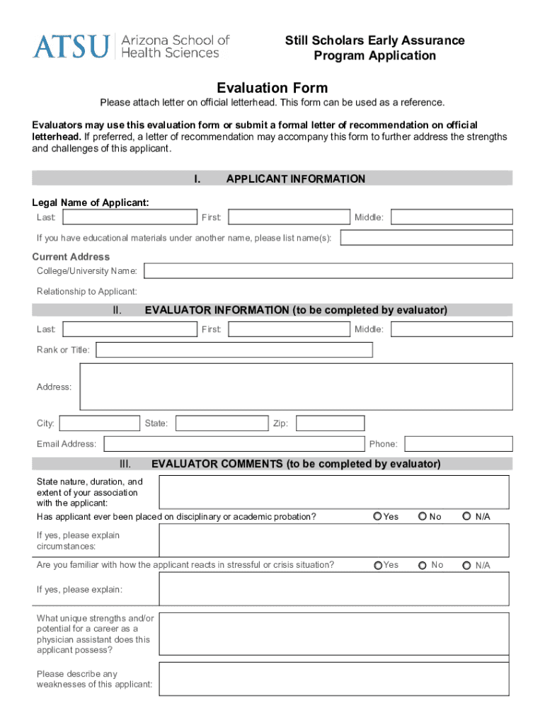Still Scholars Early Assurance Program ApplicationEvaluation Formulas attach letter on official letterhead. This form can be used as a reference. Evaluators may use this evaluation form or submit