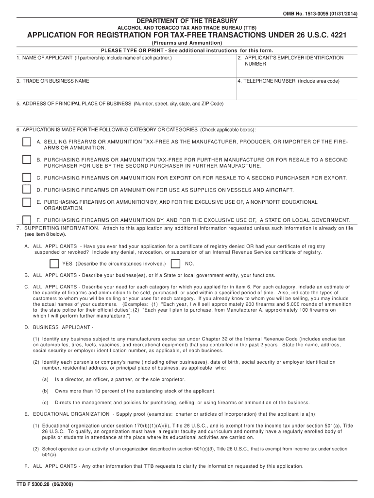 OMB No. 1513-0095 (01/31/2014) DEPARTMENT OF THE TREASURY ALCOHOL AND TOBACCO TAX AND TRADE BUREAU (TT) APPLICATION FOR REGISTRATION FOR TAX-FREE TRANSACTIONS UNDER 26 U.S.C. 4221 (Firearms and Ammunition)