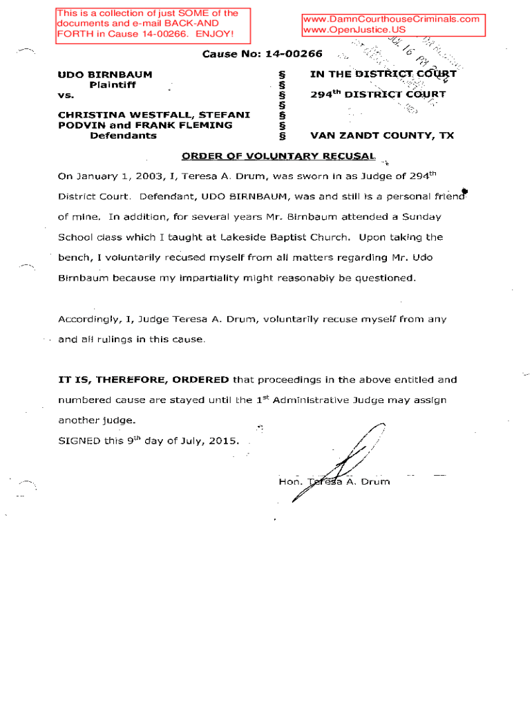 This is a collection of just Some documents and email BACKHAND FORTH in Cause 1400266. ENJOY!www.DamnCourthouseCriminals.com www.OpenJustice.USCause No: 1400266 UDO BIRNBAUM Plaintiff vs. CHRISTINA