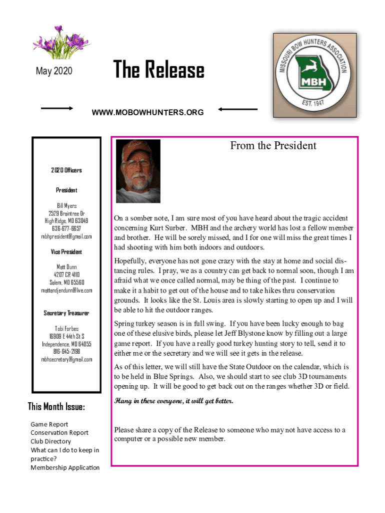 The Release May 2020WWW.MOBOWHUNTERS. From the President 2020 Officers President Bill Myers 2529 Braintree Dr High Ridge, MO 63049 6366776657 mbhpresident@gmail.com Vice President Matt Dunn 4207 CR