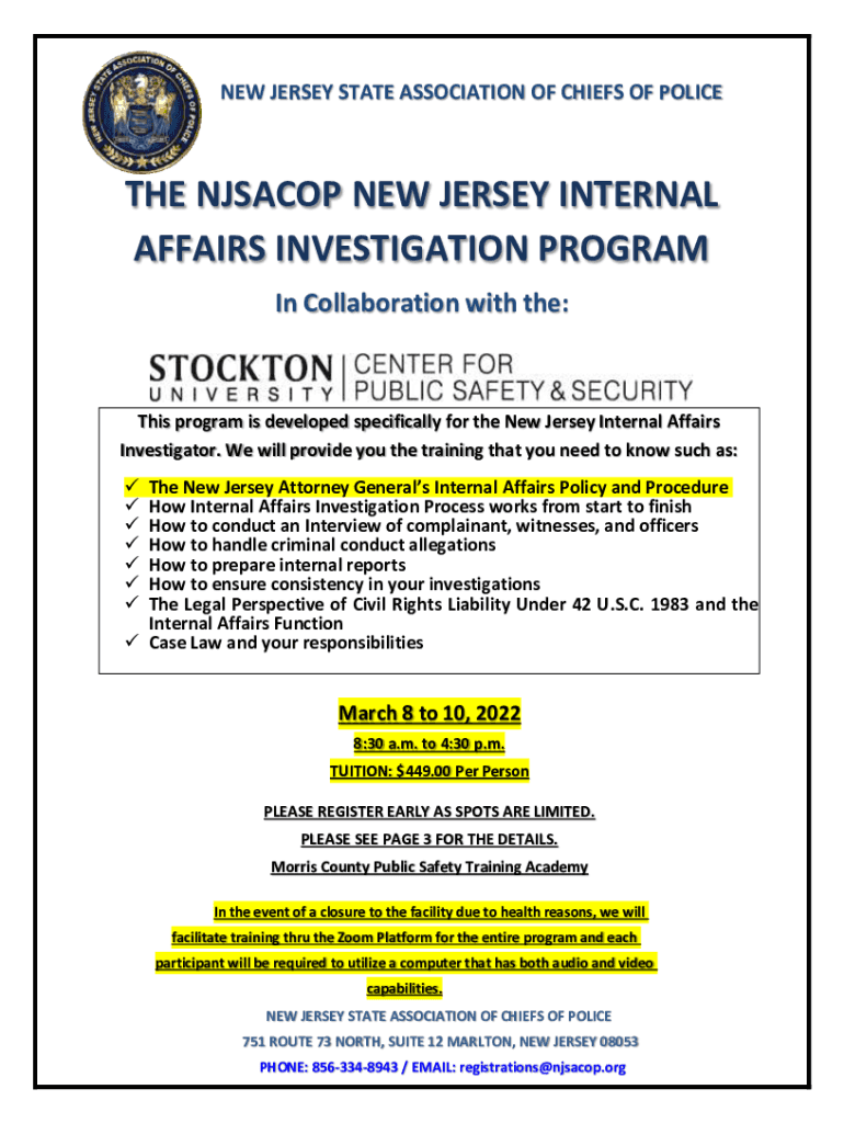NEW JERSEY STATE ASSOCIATION OF CHIEFS OF POLICE JACOB NEW JERSEY INTERNAL AFFAIRS INVESTIGATION PROGRAM In Collaboration with the:This program is developed specifically for the New Jersey Internal