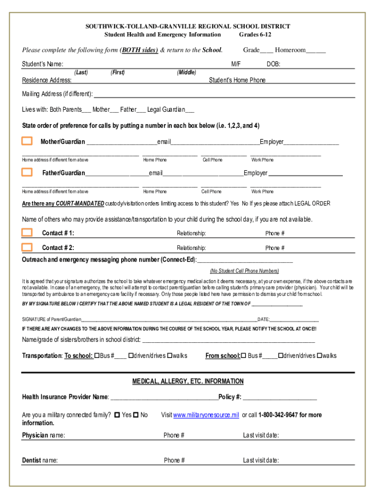 SOUTHWICKTOLLANDGRANVILLE REGIONAL SCHOOL DISTRICT Student Health and Emergency Information Grades 612Please complete the following form (BOTH sides) & return to the School. Students Name:Grade___