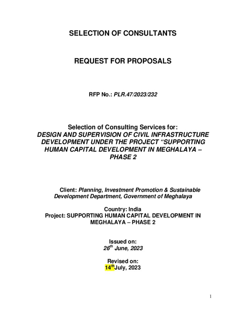 SELECTION OF CONSULTANTSREQUEST FOR PROPOSALS RFP No.: PLR.47/2023/232Selection of Consulting Services for: DESIGN AND SUPERVISION OF CIVIL INFRASTRUCTURE DEVELOPMENT UNDER THE PROJECT SUPPORTING