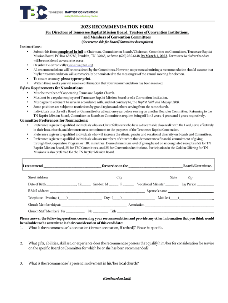 2023 RECOMMENDATION FORM For Directors of Tennessee Baptist Mission Board, Trustees of Convention Institutions, and Members of Convention Committees (See reverse side for Board/Committee descriptions)Instructions: