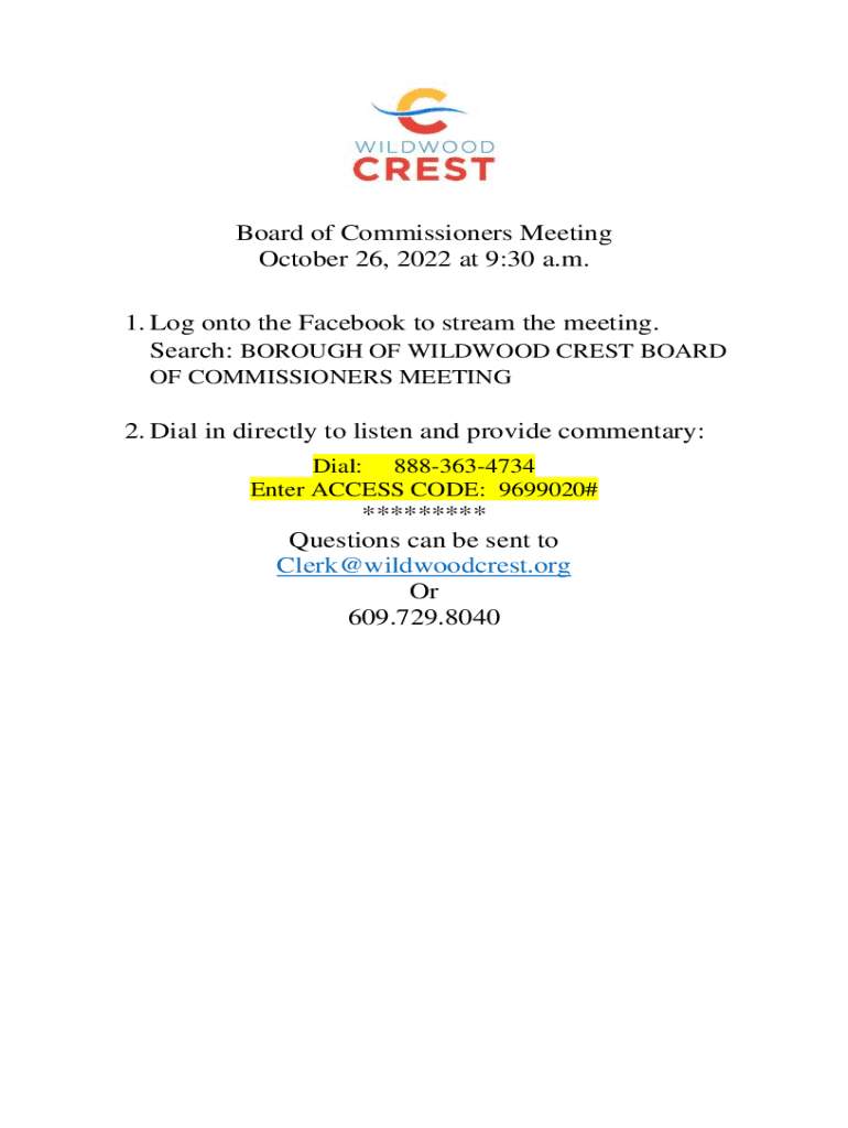 Board of Commissioners Meeting October 26, 2022, at 9:30 a.m. 1. Log onto the Facebook to stream the meeting. Search: BOROUGH OF WILDWOOD CREST BOARD OF COMMISSIONERS MEETING2. Dial in directly to