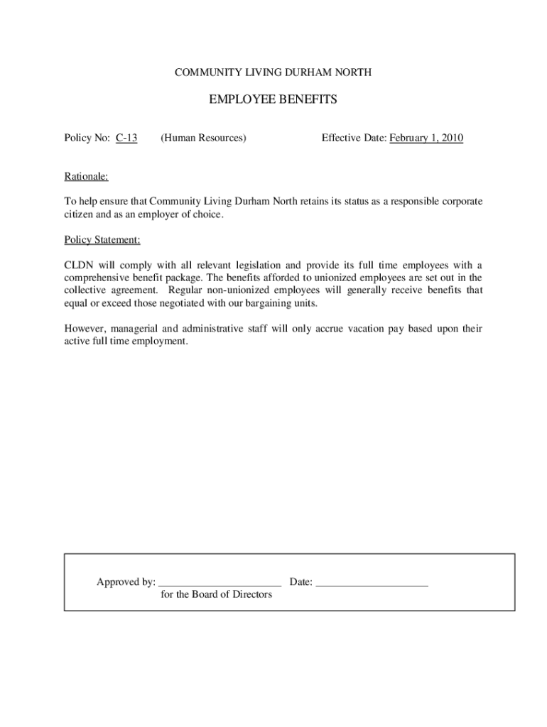 COMMUNITY LIVING DURHAM NORTHEMPLOYEE BENEFITS Policy No: C13(Human Resources)Effective Date: February 1, 2010Rationale: To help ensure that Community Living Durham North retains its status as a responsible