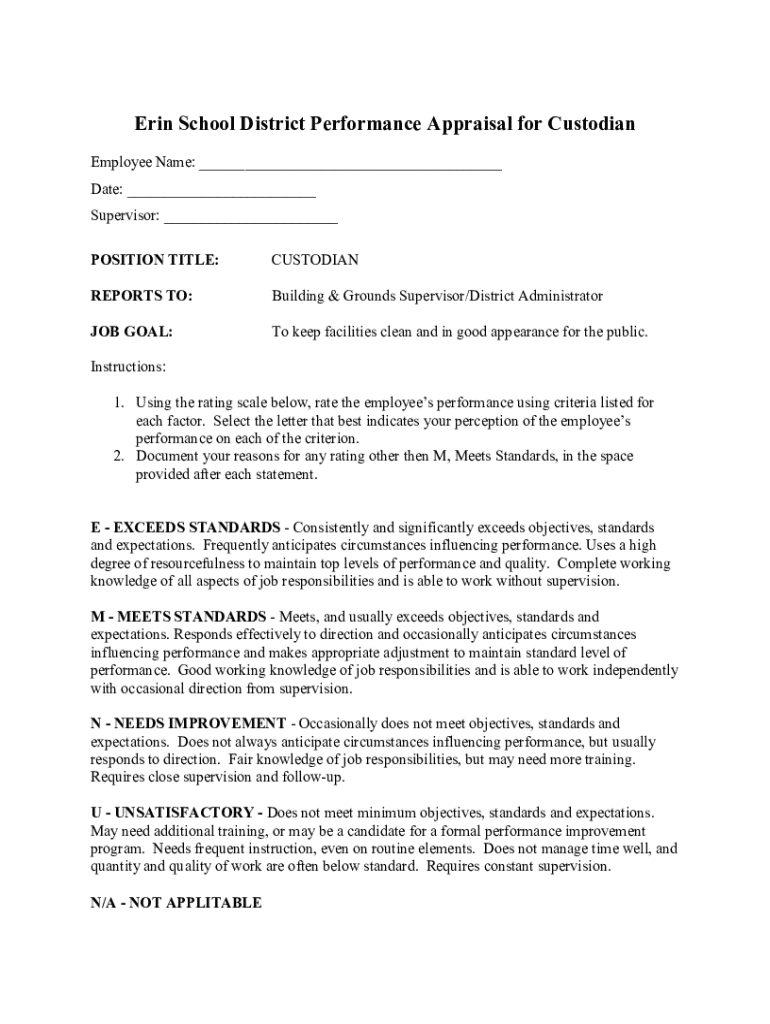 Erin School District Performance Appraisal for Custodian Employee Name: ___ Date: ___ Supervisor: ___ POSITION TITLE:CUSTODIANREPORTS TO:Building & Grounds Supervisor/District Administrator GOAL:To