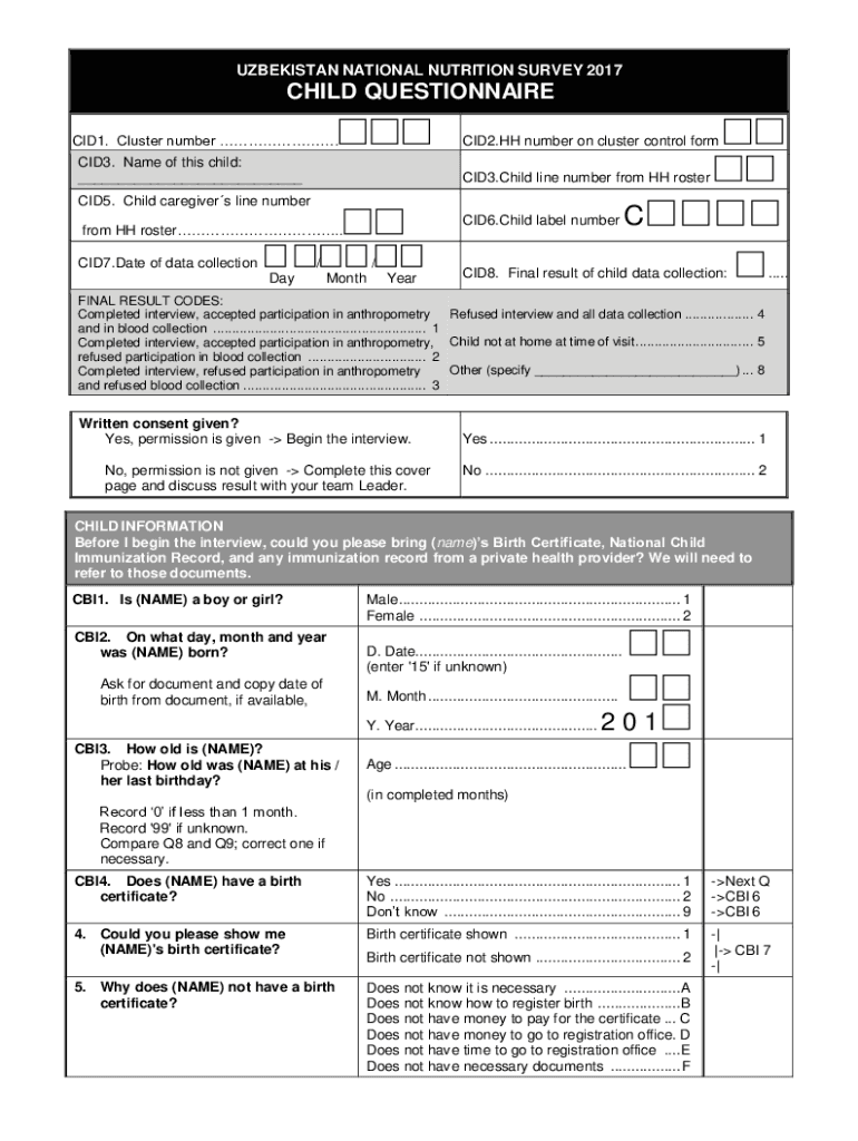 UZBEKISTAN NATIONAL NUTRITION SURVEY 2017CHILD QUESTIONNAIRE CID1. Cluster number.CID2.HH number on cluster control formCID3. Name of this child: ___CID3. Child line number from HH rosterCID5. Child