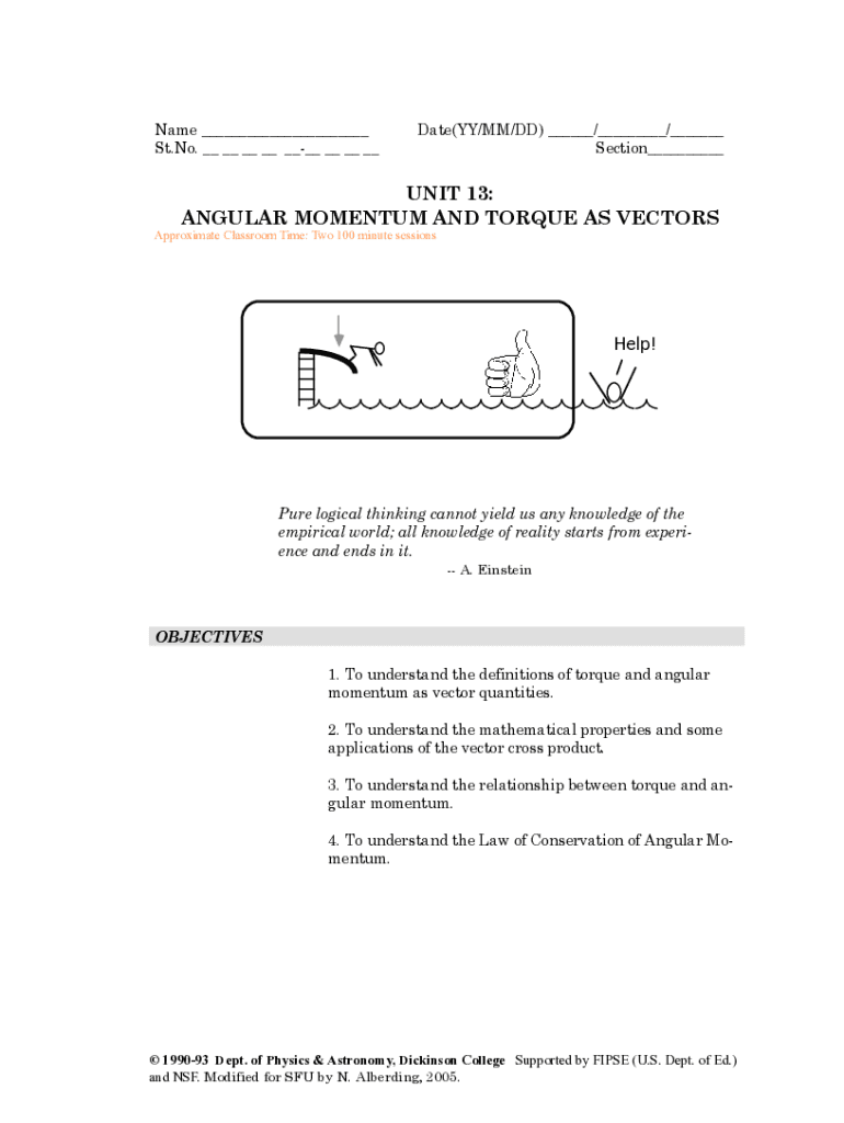 Name ___ St. No. __ __ __ __ ____ __ __ __Date(BY/MM/DD) ___/___/___ Section___UNIT 13: ANGULAR MOMENTUM AND TORQUE AS VECTORSApproximate Classroom Time: Two 100 minute sessionsHelp! Pure logical
