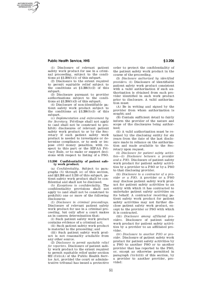 Public Health Service, HHS 3.206(1) Disclosure of relevant patient safety work product for use in a criminal proceeding, subject to the conditions at 3.206(b)(1) of this subpart. (2) Disclosure to