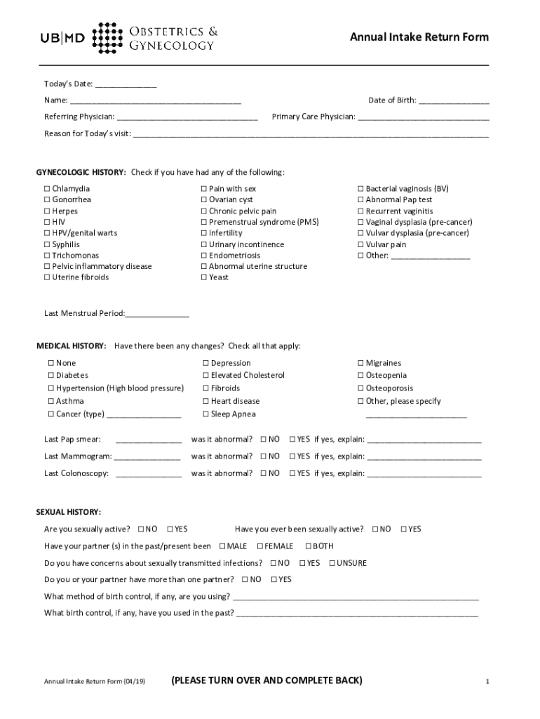 Name: ___Date of Birth: ___Referring Physician: ___Primary Care Physician: ___Reason for Today's visit: ___GYNECOLOGIC HISTORY: Check if you have had any