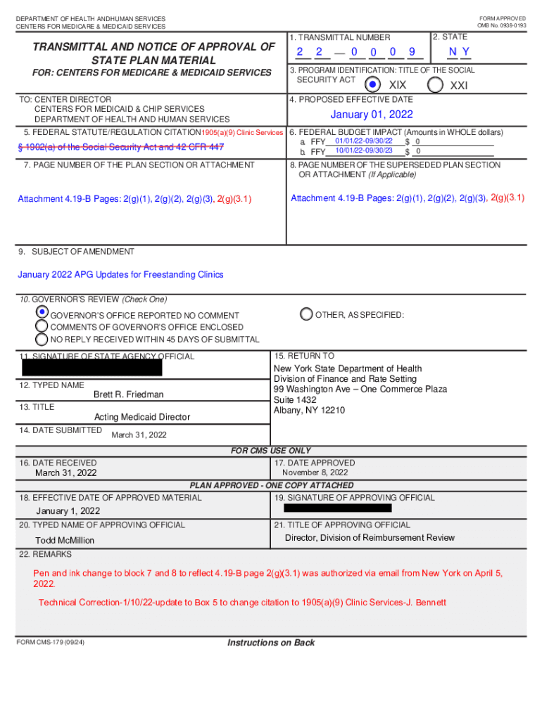 Table of Contents State/Territory Name: New York State Plan Amendment (SPA) NY: 220009 This file contains the following documents in the order listed: 1) Approval Letter 2) CMS 179 Form/Summary Form