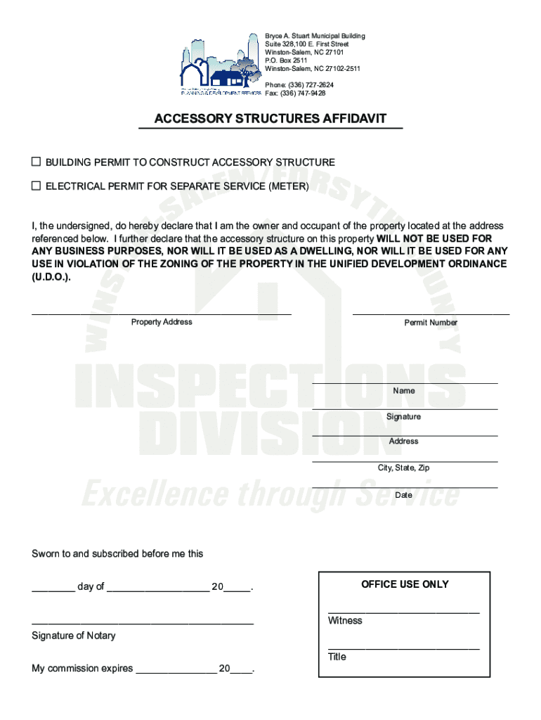 Bryce A. Stuart Municipal Building Suite 328,100 E. First Street Winston-Salem, NC 27101 P.O. Box 2511 Winston-Salem, NC 271022511 Phone: (336) 7272624 Fax: (336) 7479428ACCESSORY STRUCTURES AFFIDAVIT