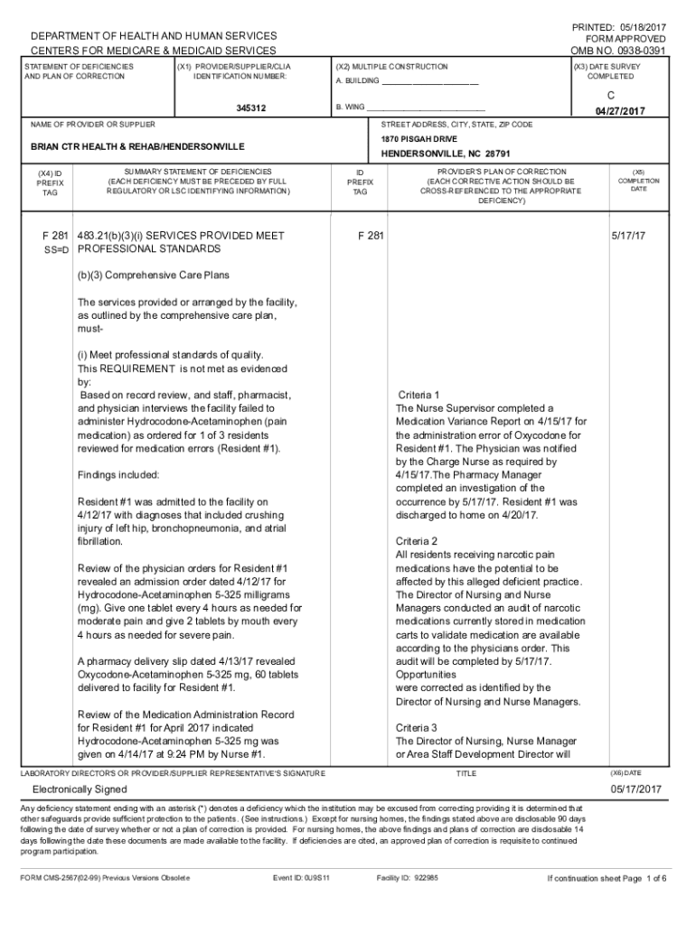 PRINTED: 05/18/2017 FORM APPROVEDDEPARTMENT OF HEALTH AND HUMAN SERVICES CENTERS FOR MEDICARE & MEDICAID SERVICES STATEMENT OF DEFICIENCIES AND PLAN OF CORRECTION(X1) PROVIDER/SUPPLIER/CIA IDENTIFICATION
