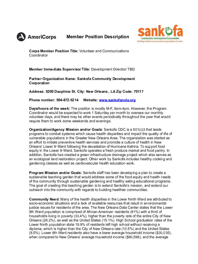 Member Position Description Corps Member Position Title: Volunteer and Communications CoordinatorMember Immediate Supervisor Title: Development Director/ TBD Partner Organization Name: Sankara Community