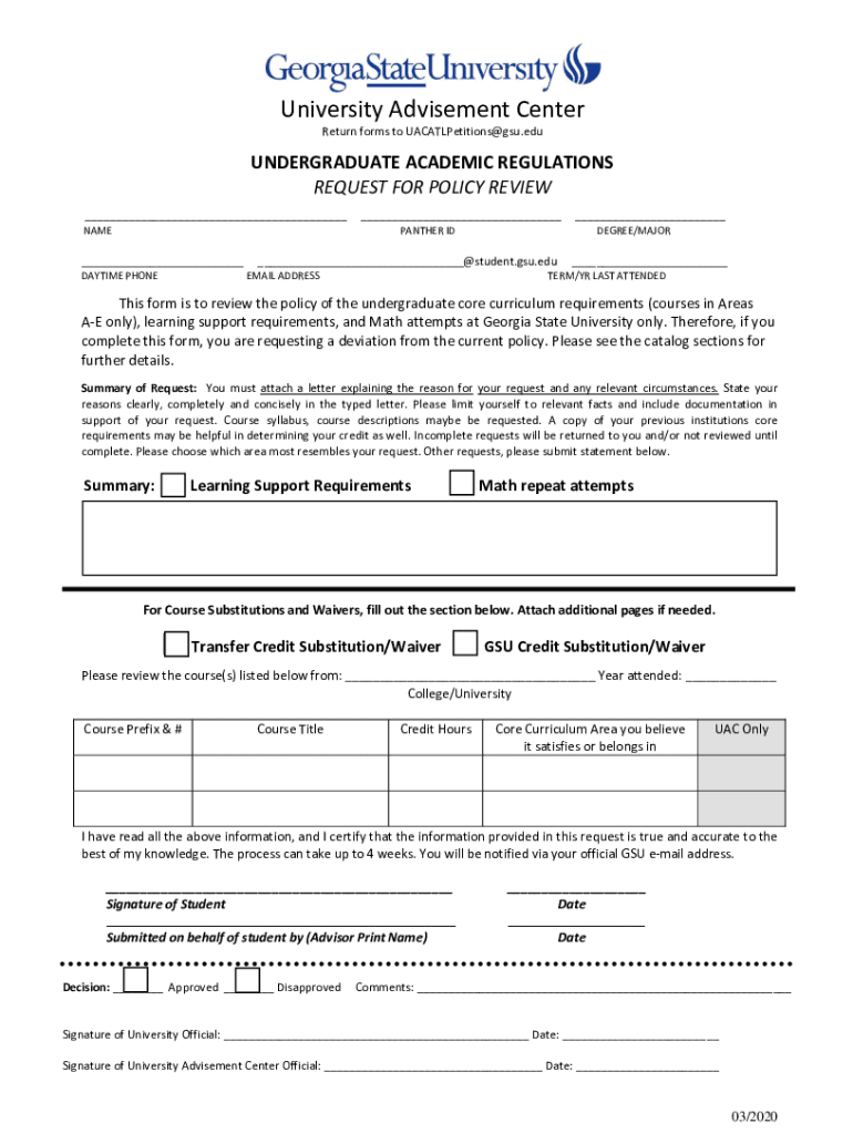 University Advisement Center Return forms to UACATLPetitions@gsu.eduUNDERGRADUATE ACADEMIC REGULATIONS REQUEST FOR POLICY REVIEW ___ NAME______PANTHER ID___ DAYTIME PHONEDEGREE/MAJOR___@student.gsu.edu