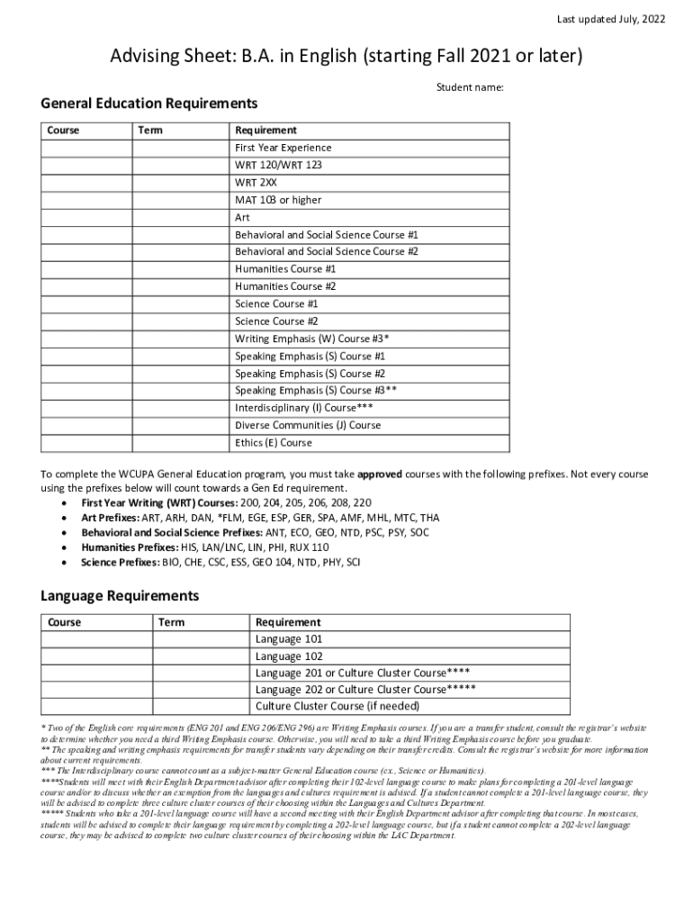 Get the free Advising Sheet: B.A. in English (starting Fall 2021 or later)
