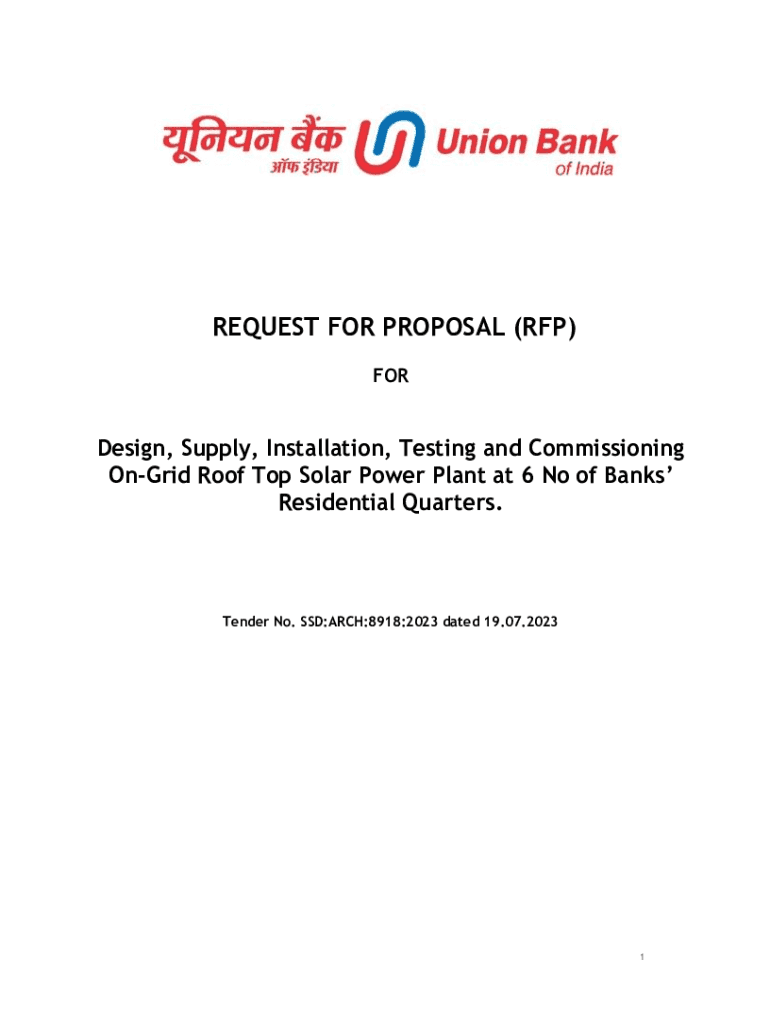 REQUEST FOR PROPOSAL (RFP) Foreign, Supply, Installation, Testing and Commissioning Ingrid Roof Top Solar Power Plant at 6 No of Banks Residential Quarters. Tender No. SSD:ARCH:8918:2023 dated 19.07.20231RFP