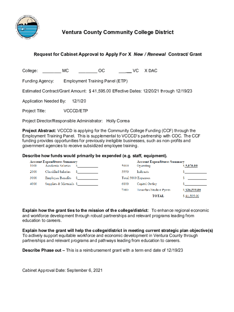Ventura County Community College DistrictRequest for Cabinet Approval to Apply For X New / Renewal Contract/ Grant