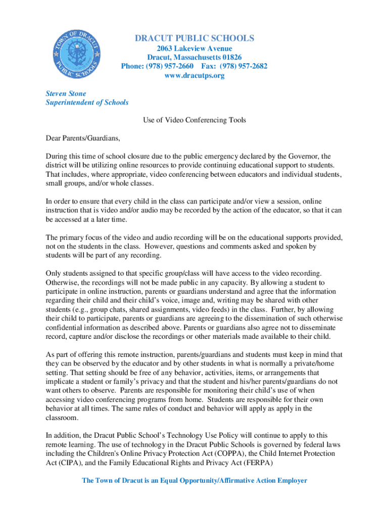 DRAC UT PUBLIC SCHOOLS 2063 Lake view Avenue Draft, Massachusetts 01826 Phone: (978) 9572660 Fax: (978) 9572682 www.dracutps.org Steven Stone Superintendent of Schools Use of Video Conferencing Tools